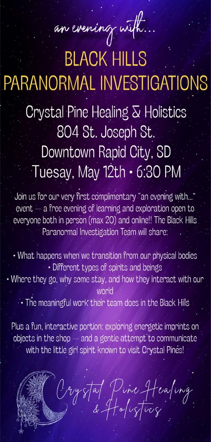 Join us for our very first complimentary “an evening with…” event — a free evening of learning and exploration open to everyone both in person (max 20) and online!! The Black Hills Paranormal Investigation Team will share: